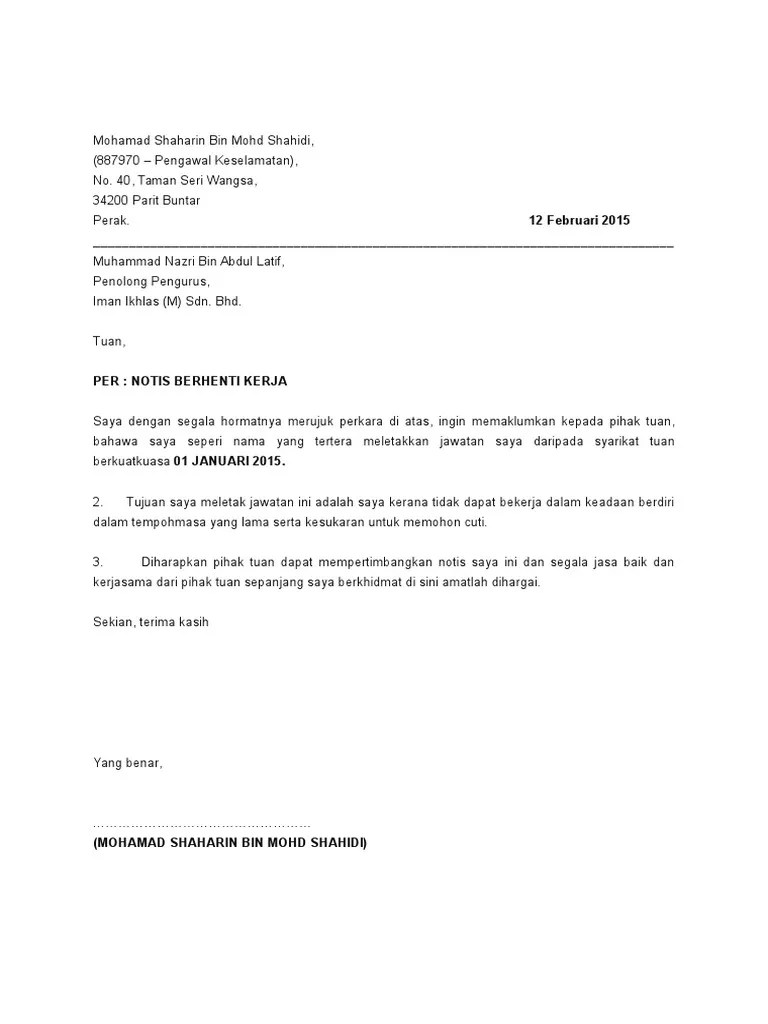 Notis Letak Jawatan Sebulan / Surat Perletakan Jawatan Kerana Masalah Peribadi Letter 7saudara Com